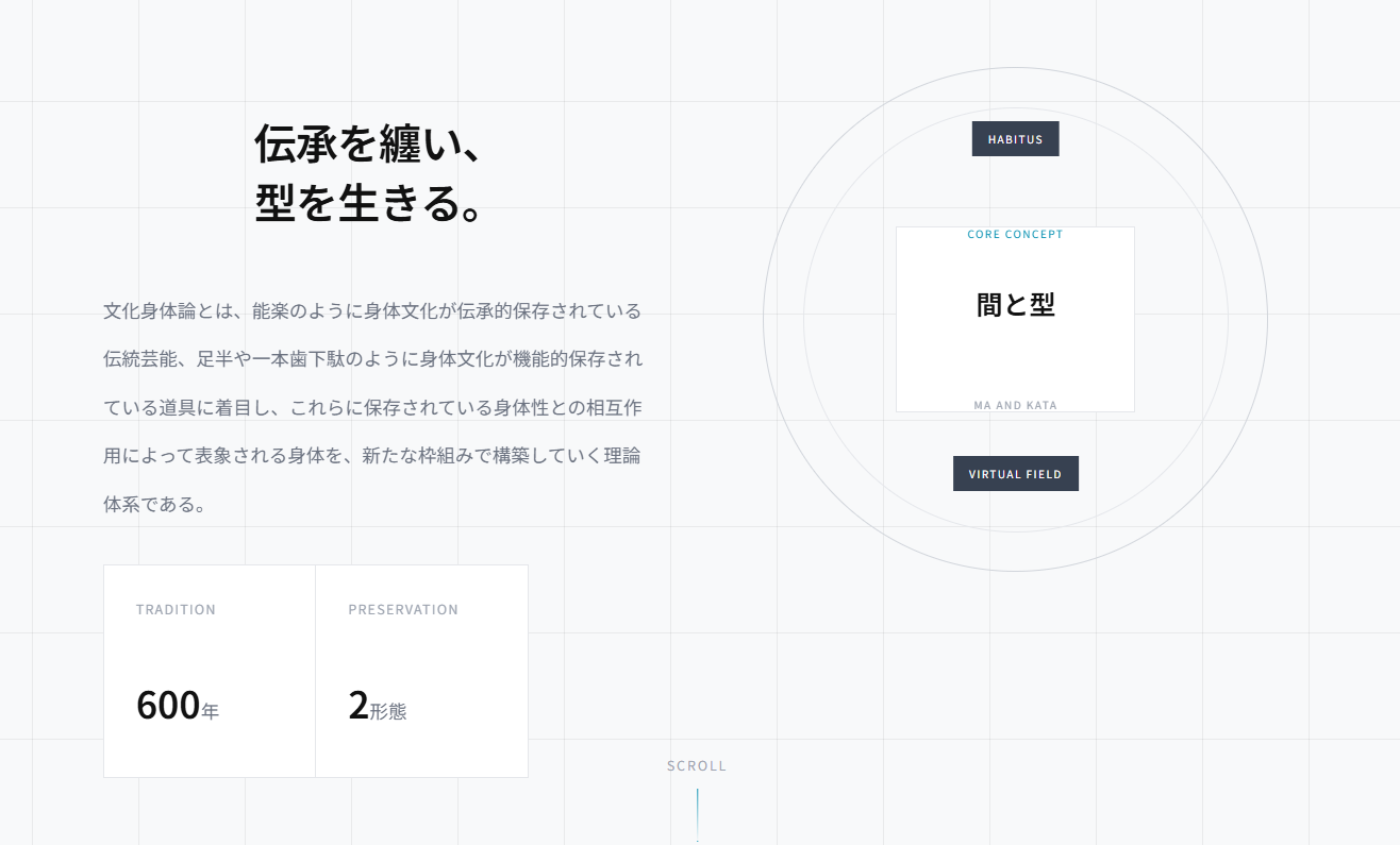 能楽は600年以上前の中世からの身体文化、身体技法を型によって脈々と受け継ぐ界である。能役者の身体は、何世代にも渡る能にまつわる身体の記憶を伝承し、構造化している。型に何百年も前から閉じ込められたものが舞台上で解凍され、観客に感動を与える。